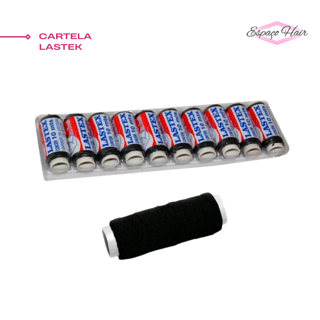 Uma cartela de lastek é um conjunto que agrupa vários rolos pequenos (10 unidades de 10 metros cada) do fio elástico lastek, utilizado principalmente em trabalhos de costura.