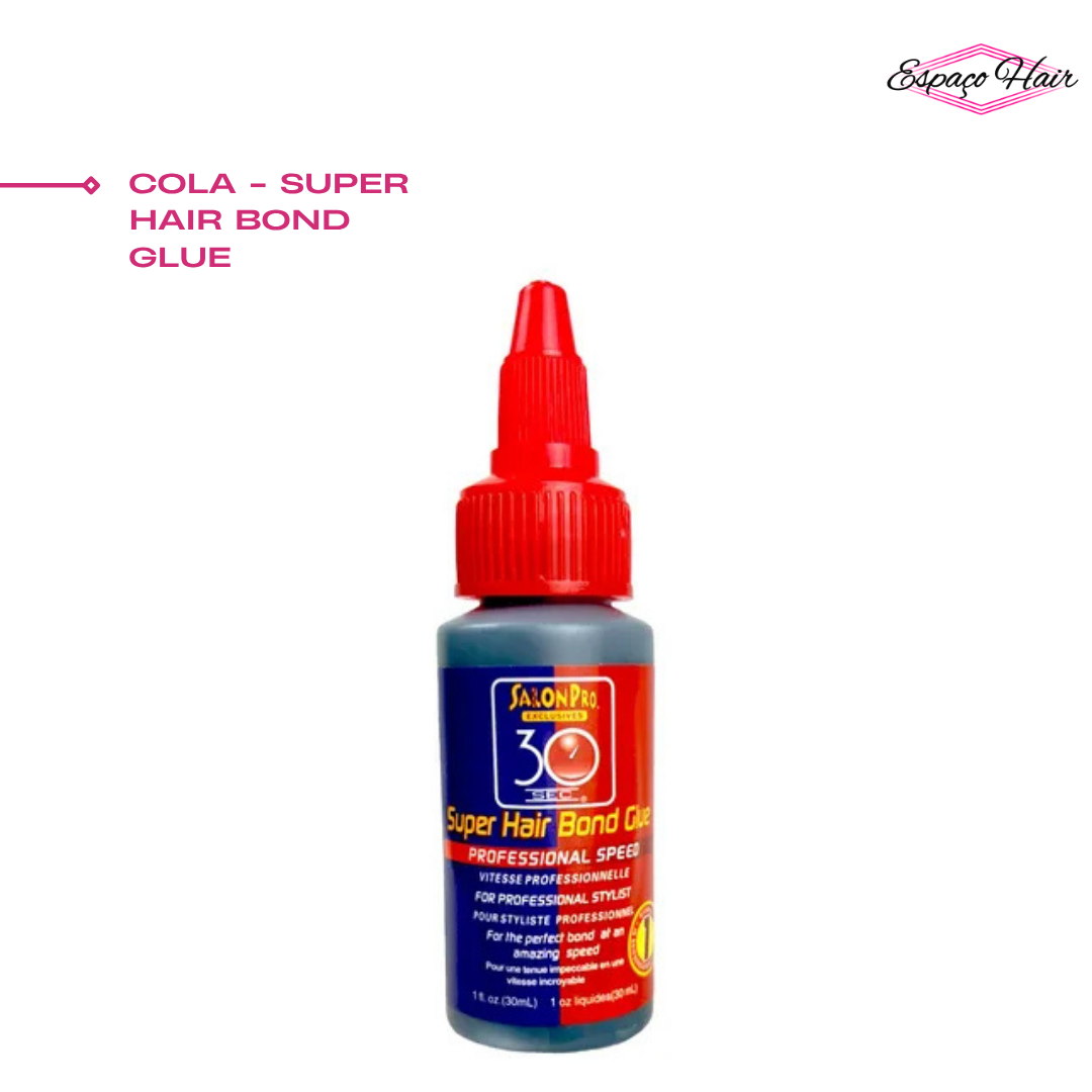 A Cola Salon Pro Super Hair Bond Glue é um adesivo líquido de fixação extra forte e rápida, com secagem em cerca de 30 segundos, projetado para alongamentos de cabelo (mega hair), perucas, laces e cílios tufinho.