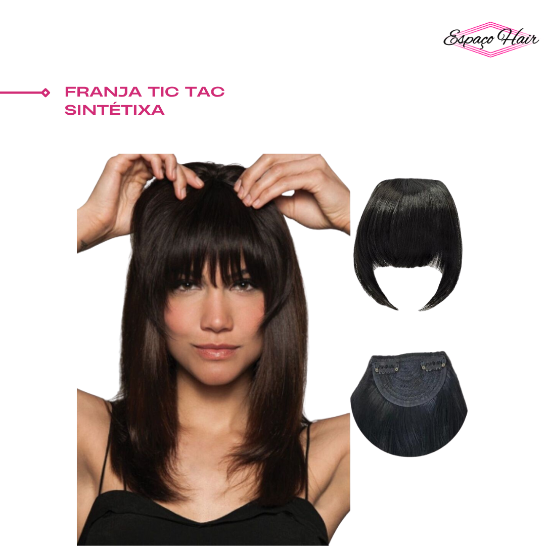é um tipo de aplique de cabelo feito de fibra sintética que possui presilhas (clips) de tic tac para fixação. É uma solução prática e temporária para mudar o visual, permitindo adicionar uma franja sem a necessidade de cortar o cabelo natural.