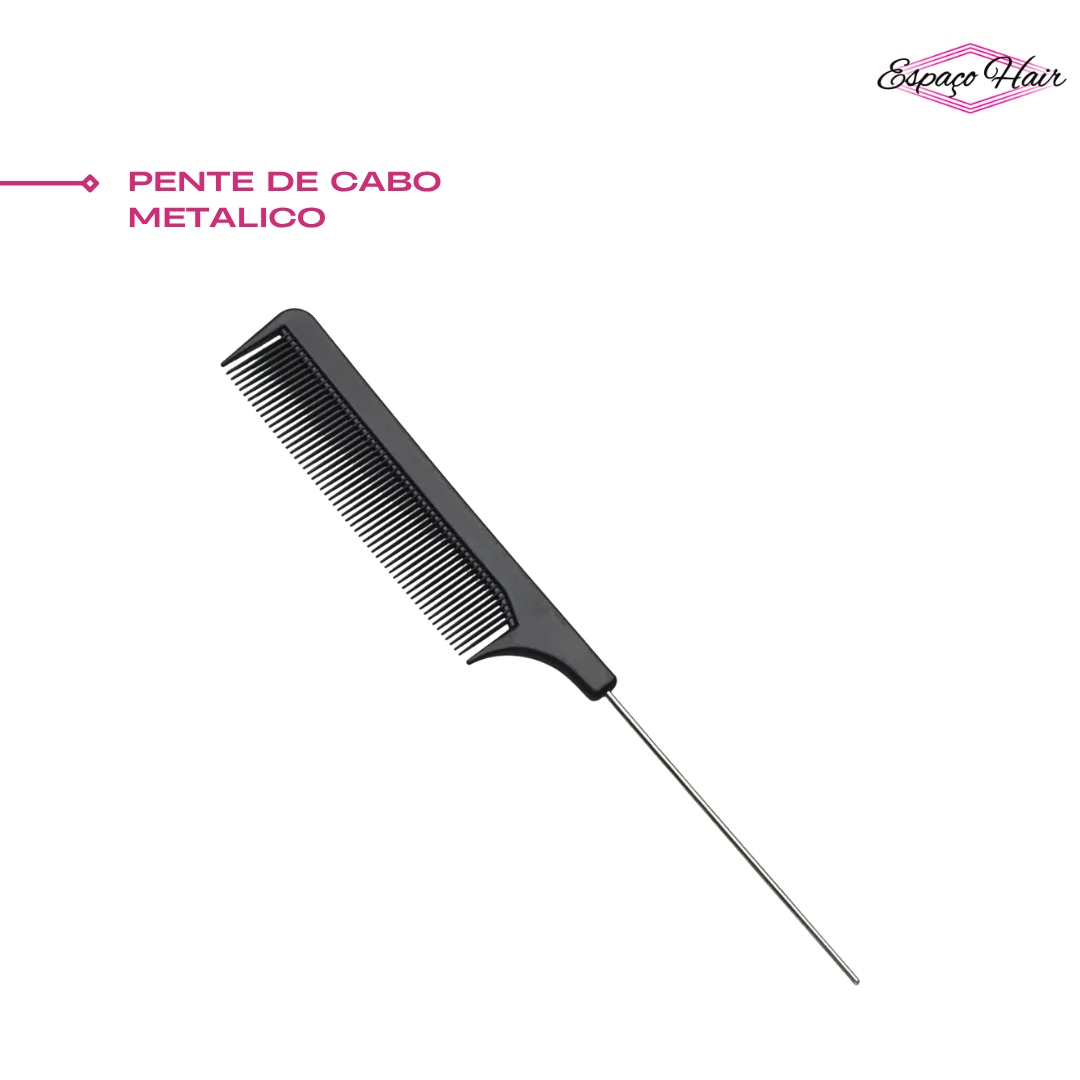 Pente de cabelo profissional com um cabo fino de metal usado para separar mechas, ou a um pente organizador de cabos de computador, que pode ser feito de metal ou plástico.